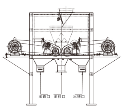 DHD型对辊干式磁选机是我公司经多年市场经验研发的一种新型干选设备。其磁系经过特殊设计、属于永磁局部半闭合磁系结构;磁感应强度大并且可在13000GS~20000GS范围内进行调节。将物料均匀的送到磁选区域后,在设备的磁选区受到重力和磁场力的作用下,利用物料的磁性差异有不同的运动轨迹实现分离,磁性矿物被吸附在磁辊表面旋转到达精矿区,毛刷将吸附在磁辊表面上的磁性矿刷脱。该机对粉矿率较少但又均匀的中小颗粒状矿石分选效果卓越,生产效率高,操作简单方便。适用于硅粉、石英石、锆石、长石等细粒级的非磁性矿石去除磁性物提纯作业。